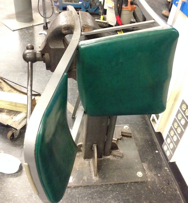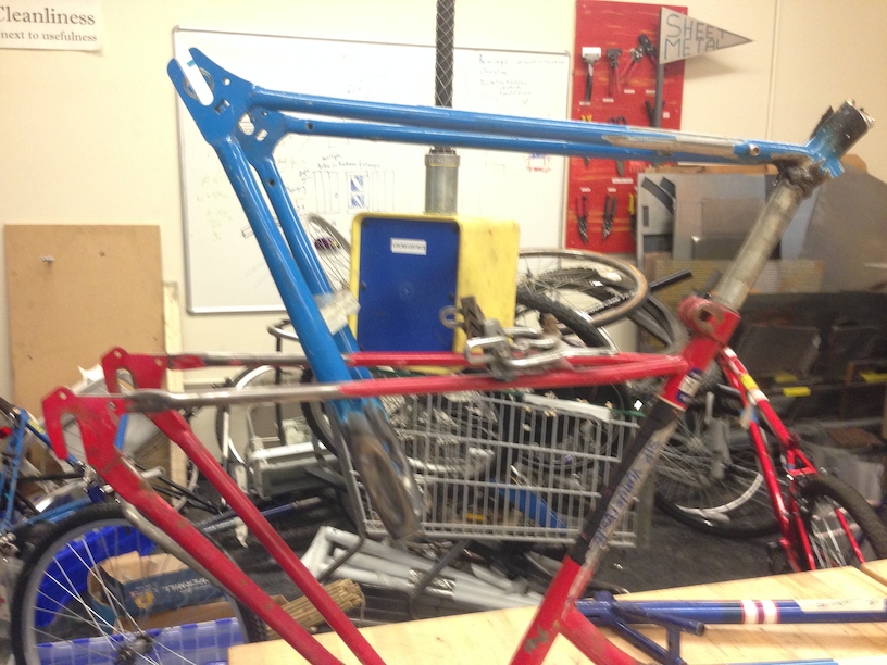 In order to keep the chair more or less level with the ground, we used the rear triangle from another bicycle and welded it on top of our own - basically making double decker seat stays. Unfortunately, the jig we used to weld these wasn't as great as it should have been, and the seat stays turned out crooked relative to one another. But after breaking the welds and hammering the triangles into the right angles, we were able to level them out.