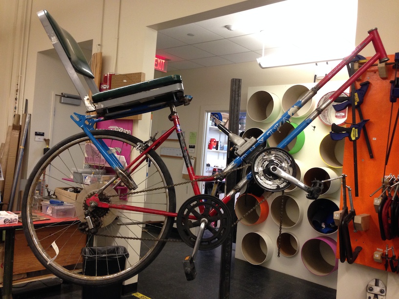 The brainstorming process took the longest amount of time, but we finally settled on an idea - a recumbent bicycle with a hand pedaling mechanism. After making our initial design and collecting the bikes and parts we would need, we started dissassembly